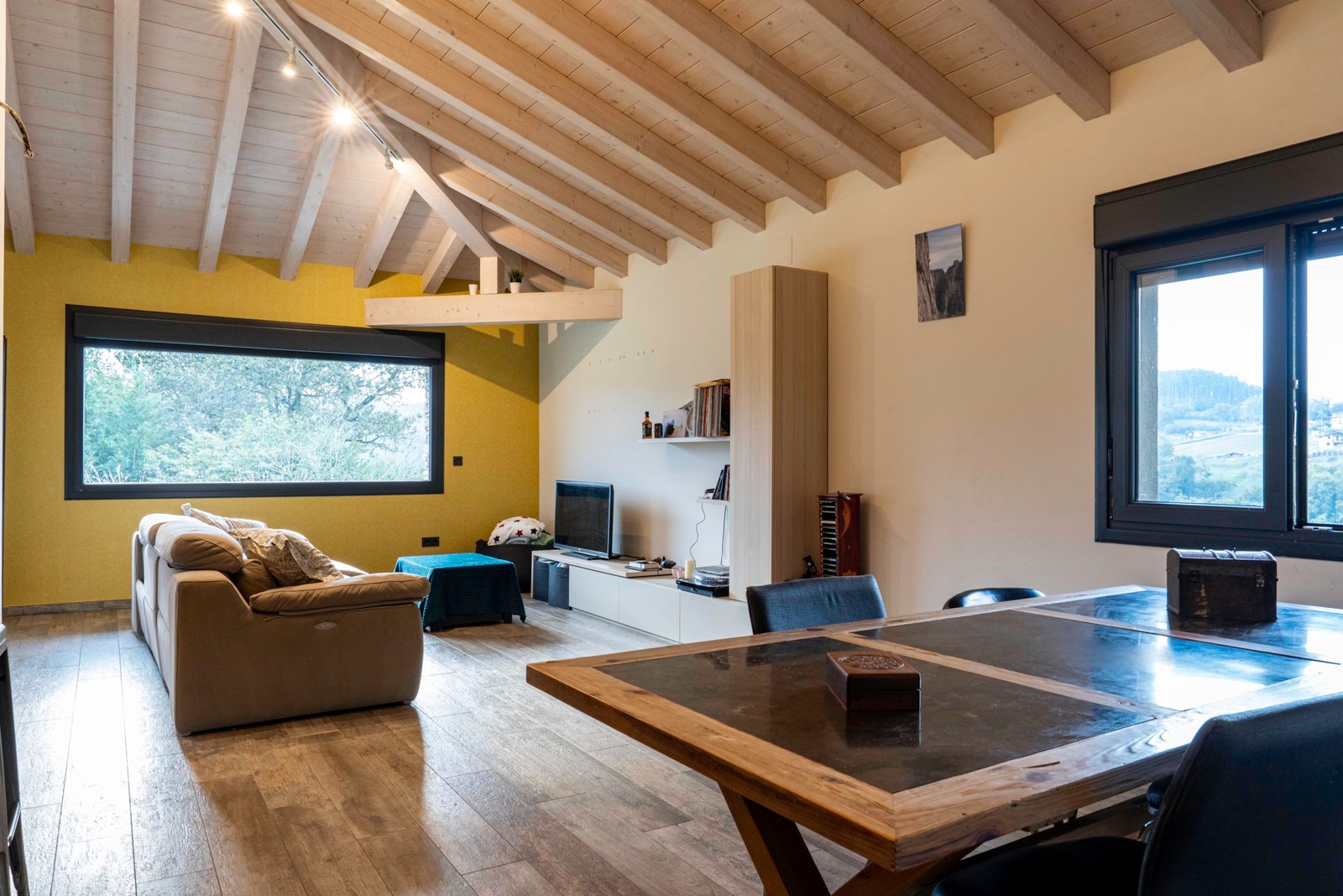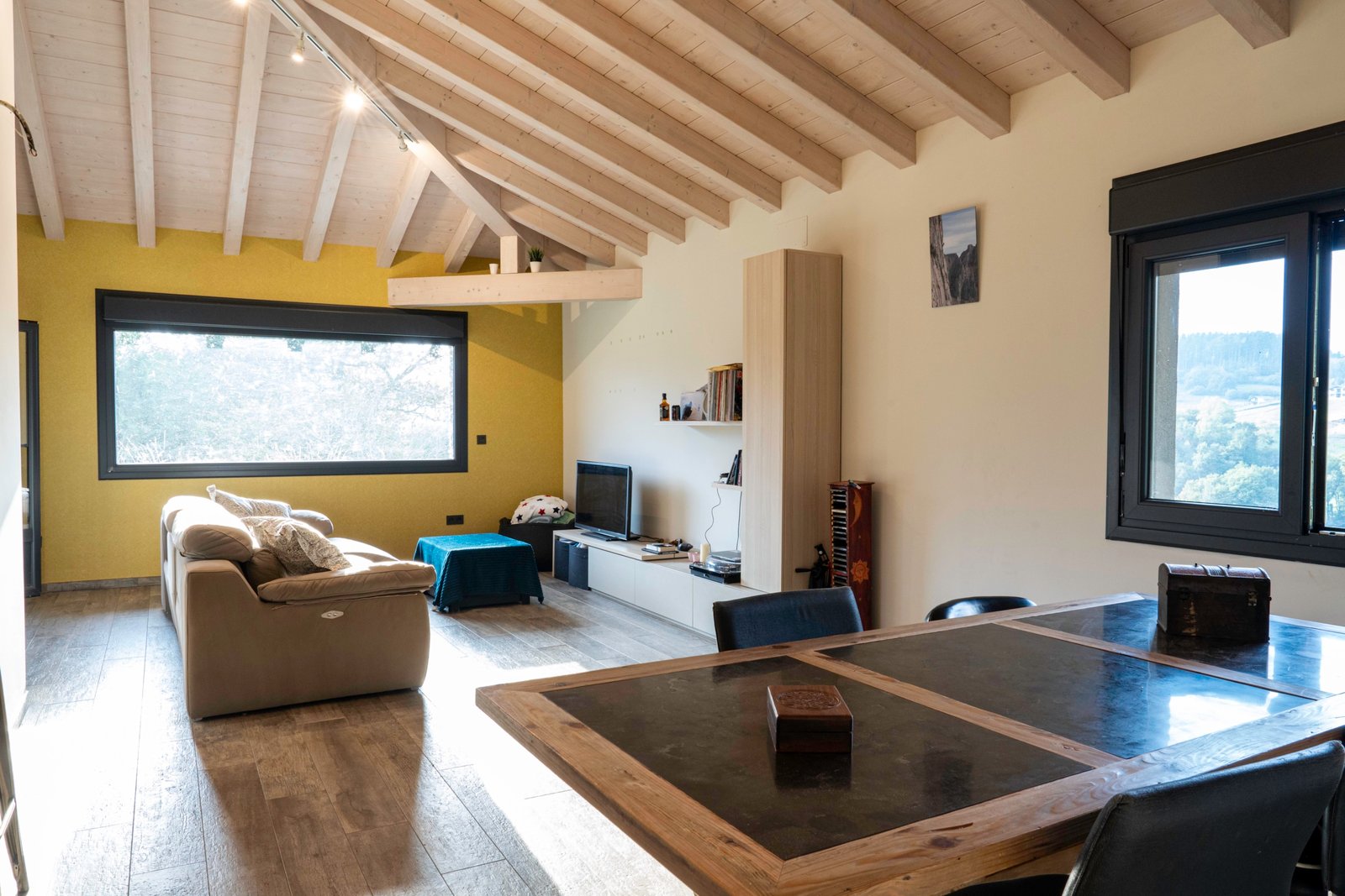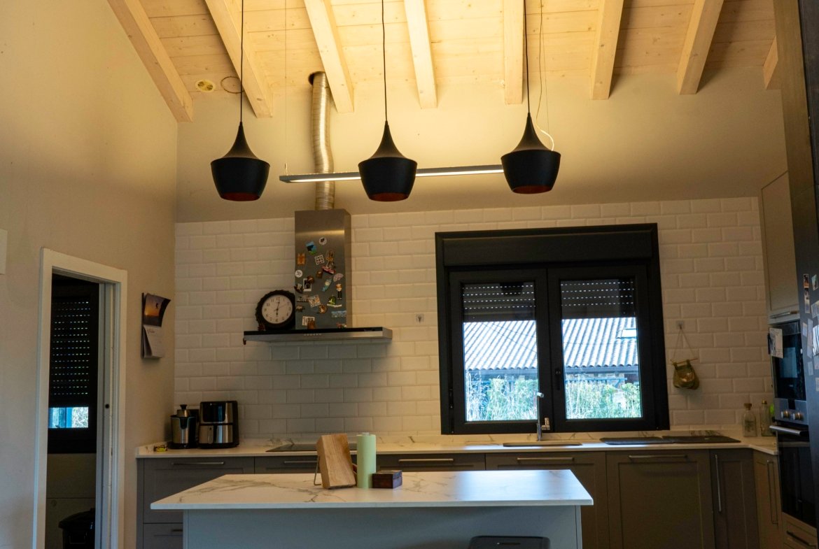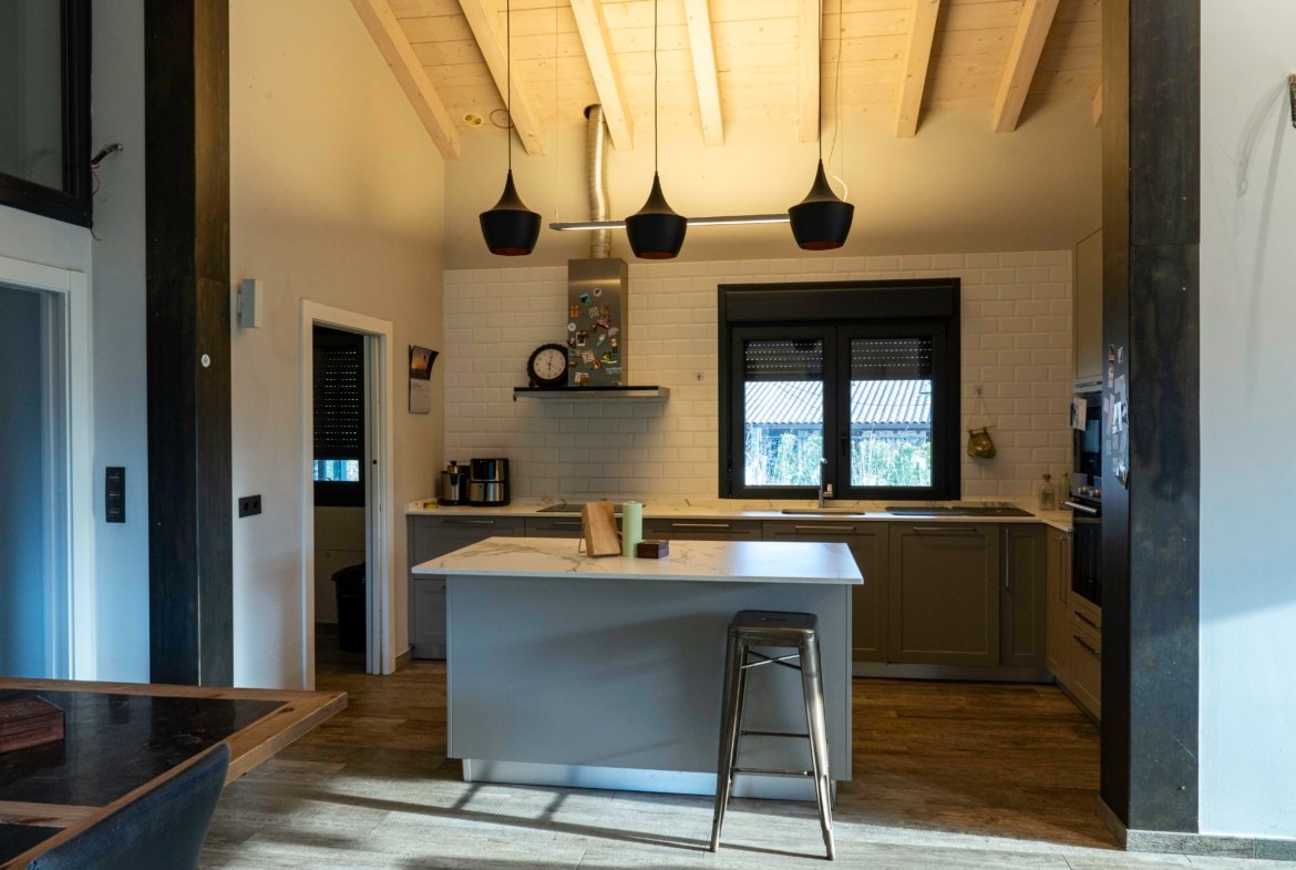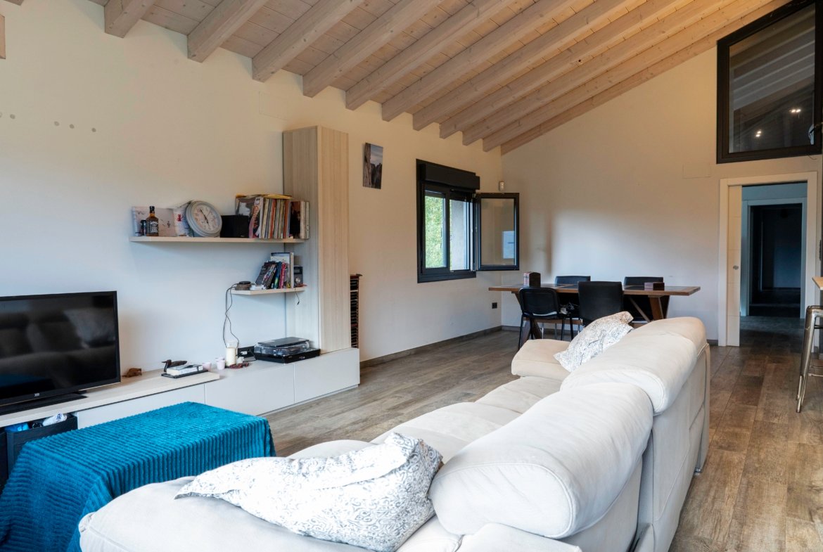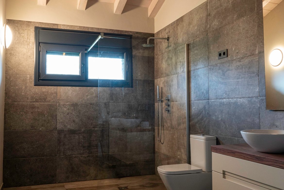 Con una planta principal de 205 metros cuadrados, la vivienda destaca por su amplitud y su diseño contemporáneo, donde la luz natural es protagonista. Dispone de cuatro habitaciones y un espectacular espacio abierto que integra la cocina con isla, el comedor y el salón, creando un ambiente cálido y social que invita a compartir momentos. Desde sus amplios ventanales se disfrutan unas vistas totalmente despejadas al paisaje verde que define el entorno de Dima.