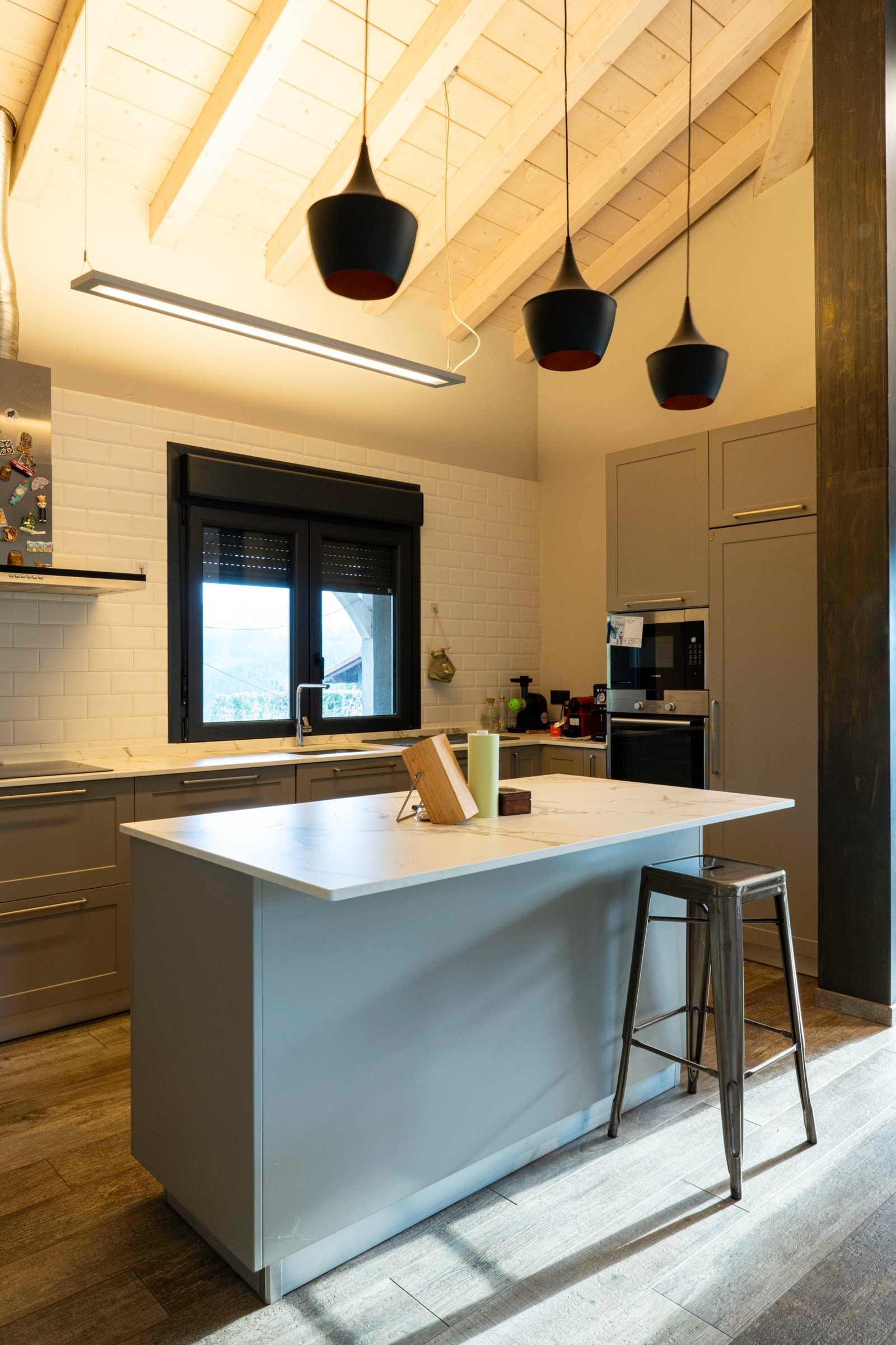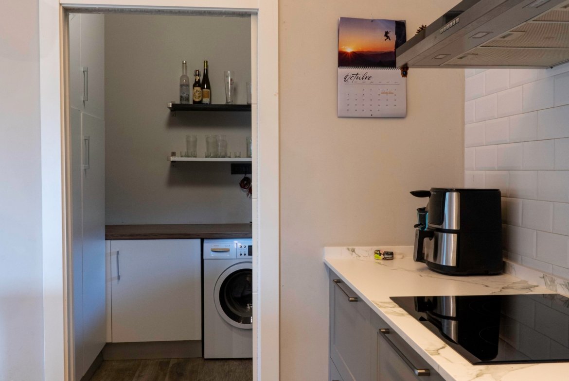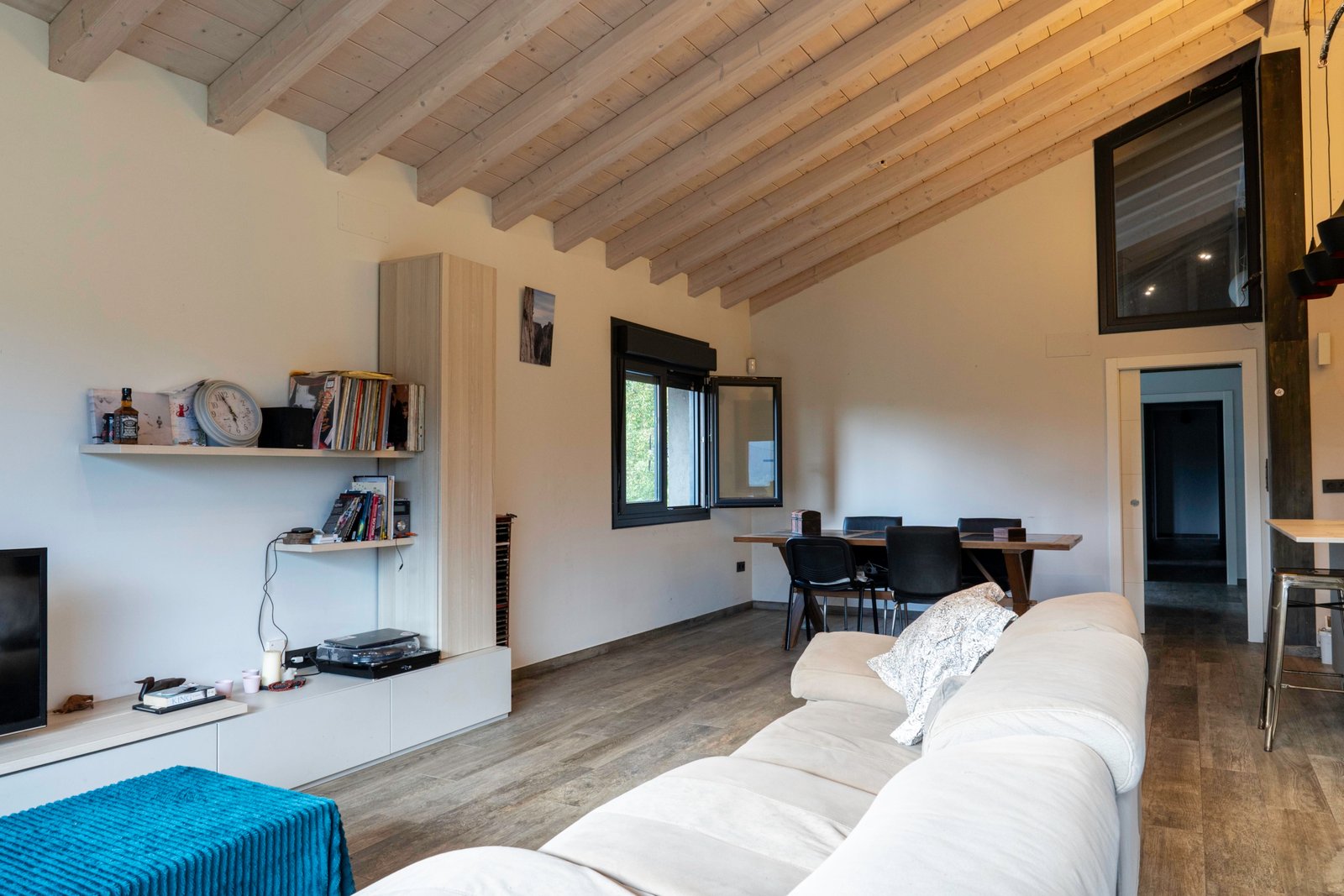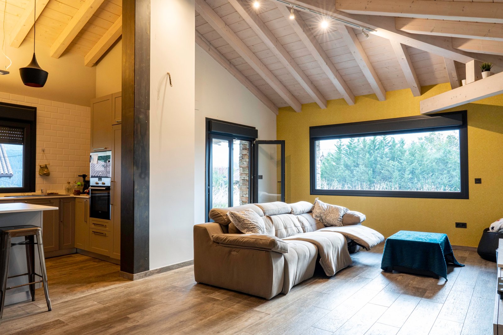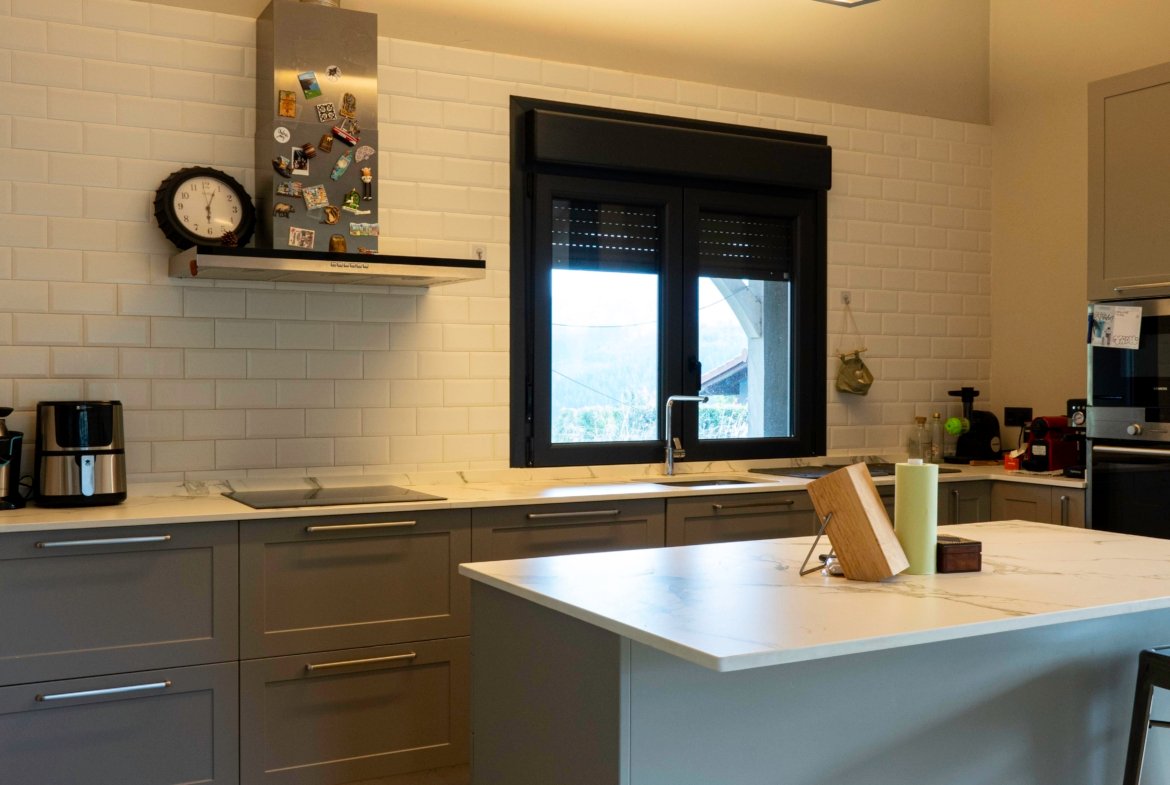 Con una planta principal de 205 metros cuadrados, la vivienda destaca por su amplitud y su diseño contemporáneo, donde la luz natural es protagonista. Dispone de cuatro habitaciones y un espectacular espacio abierto que integra la cocina con isla, el comedor y el salón, creando un ambiente cálido y social que invita a compartir momentos. Desde sus amplios ventanales se disfrutan unas vistas totalmente despejadas al paisaje verde que define el entorno de Dima.